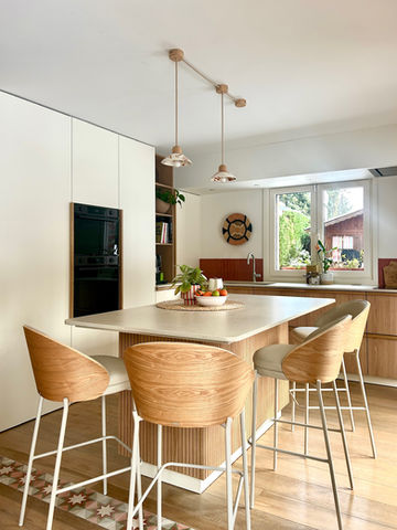 Cette magnifique cuisine ouverte sur la salle à manger et face au jardin est accueillante notamment par le choix de ses teintes chaudes. Le plan de travail en Dekton Danae beige ainsi que les façades en bois Chêne Adrian se marient parfaitement avec le choix de la crédence couleur Terracotta.